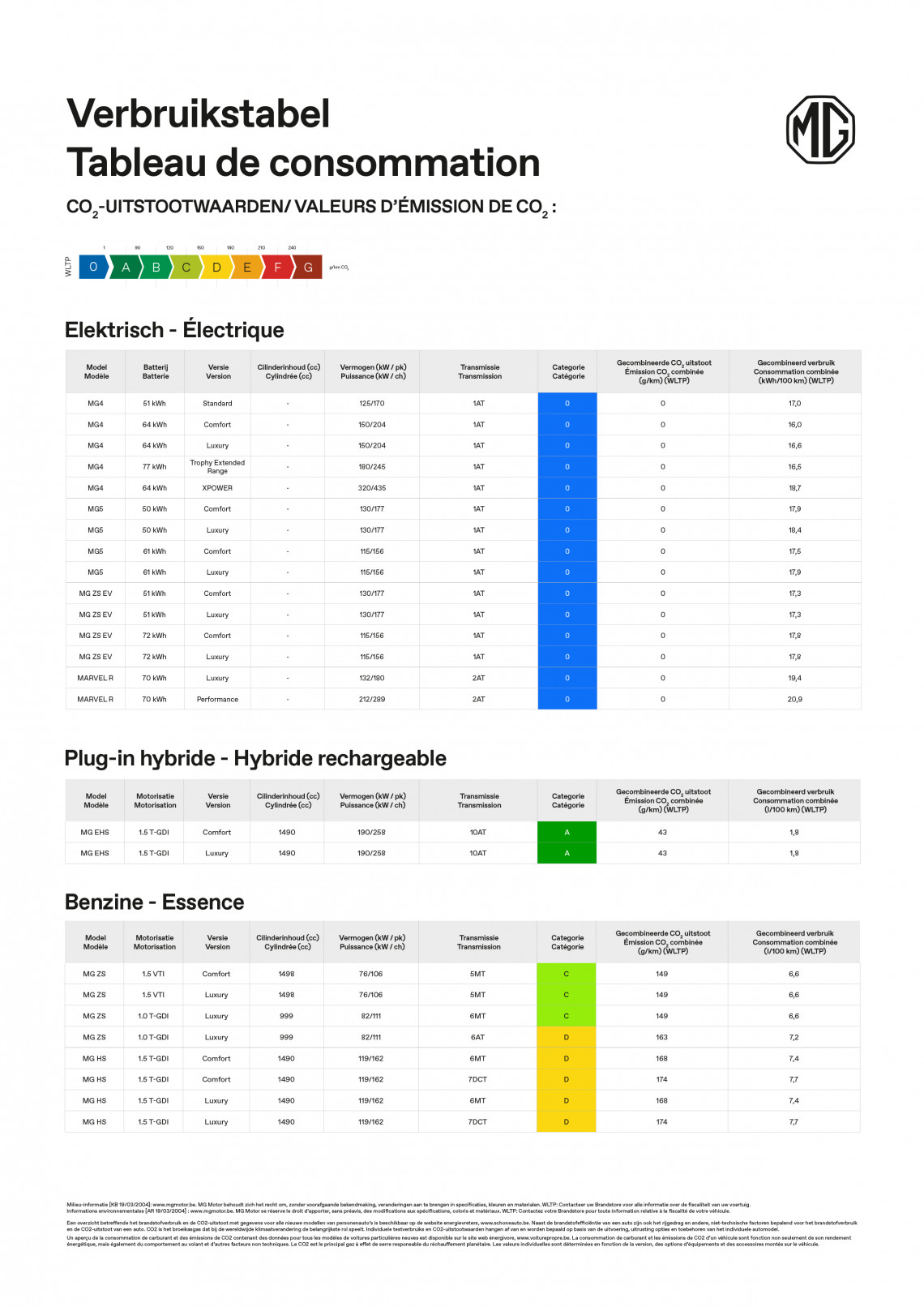 MG verbruikstabel
